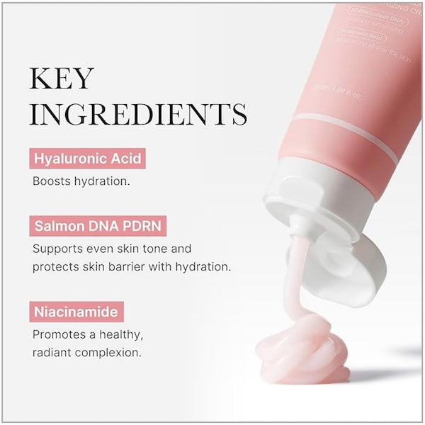 MEDICUBE PDRN Pink Hyaluronic Moisturizing Cream is formulated with Niacinamide and Salmon PDRN that helps erase the blemish and fill the moisture after two weeks. Caring for the skin barrier after erasing the blemish not only erases the current blemish but prevents the future blemish. Packed with Salmon PDRN, niacinamide and hyaluronic acids, this do-it-all face cream fades stubborn blemishes, brightens uneven skin tone and strengthens the skin barrier. Peptides and adenosine boost collagen production, revealing smooth and plump skin. Panthenol and cica extract deliver additional soothing effects. 10 layers of Hyaluronic Acid build the moisture barrier, PDRN strengthens the skin layer and cares for the skin tone, and Niacinamicide 2% brightens the dull skin.
