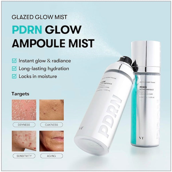 – Sold Out - Stock coming soon!VT Cosmetics PDRN Glow Ampoule is a spray ampoule with PDRN that delivers the rich nutrients of ginseng and provides a healthy glow and elasticity to skin. Give your skin a revitalizing and moisturizing boost anytime, anywhere with this spray ampoule containing ginseng-derived PDRN, as well as Cerasome Complex Plus, squalane and panthenol. Niacinamide brightens dullness and fortifies the skin barrier. This fragrance-free product won’t cause skin irritation. Simply spritz on face as needed to keep skin plump, moist and radiant all day long. This nourishing ampoule formula is sprayed finely and delicately, creating glowing skin with high adherence.